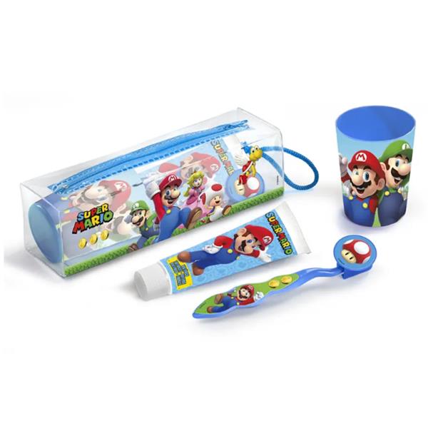 Keep your child's dental care routine fun and organized with the Super Mario Dental Travel Set. This handy set includes a toothbrush, toothpaste, and a cup, all safely stored in a convenient toiletry bag
