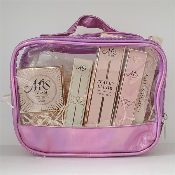 All items are housed in a holographic purple zippered pouch with a clear front panel, making it ideal for gifting or travel.